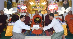 ပဲခူး ဒီဇင်ဘာ ၁၅           ပဲခူးမြို့၊ ဗုဒ္ဓအသံဓမ္မဗိမာန်တော်ကြီး၌ ဒီဇင်ဘာလ(၁၅)ရက်နေ့၊ နံနက်ပိုင်းက ပဲခူးတိုင်းဒေသကြီး (အရှေ့)ဂိုဏ်းပေါင်းစုံ သံဃနာယကနှင့် ဝိနည်းဓိုရ်မွမ်းမံသင်တန်းဖွင့်ပွဲအခမ်းအနား ကျင်းပပြုလုပ်ရာ ပဲခူးတိုင်း ဒေသကြီး ဝန်ကြီးချုပ် ဦမျိုးဆွေဝင်း တက်ရောက်ကြည်ညိုခဲ့သည်။           ရှေးဦးစွာ အခမ်းအနားအား ဆရာတော်/သံဃာတော်များ၊ ပဲခူးတိုင်းဒေသကြီး ဝန်ကြီးချုပ် ဦးမျိုးဆွေဝင်းနှင့် ဧည့်ပရိသတ်များက “နမောတဿ” မဟာပဏာန ဘုရားရှိခိုး၍ ဖွင့်လှစ်တော်မူခဲ့ကြ သည်။           ထို့နောက် နိုင်ငံတော်သံဃမဟာနာယကအဖွဲ့ဝင်၊ ပဲခူးမြို့၊ ဥဿာသီရိစာသင်တိုက် ပဓာနနာယက အဂ္ဂမဟာပဏ္ဍိတ၊ ဒေါက်တာဘဒ္ဒန္တသူရိယ မထေရ်မြတ်ထံမှ ပဲခူးတိုင်းဒေသကြီး ဝန်ကြီးချုပ် ဦးမျိုးဆွေဝင်းနှင့် ဧည့်ပရိသတ်များက ငါးပါးသီလခံယူဆောက်တည်ခဲ့ကြပြီး ပဲခူးတိုင်းဒေသကြီး(အရှေ့) ဂိုဏ်းပေါင်းစုံ သံဃနာယကနှင့် ဝိနည်းဓိုရ်မွမ်းမံသင်တန်း အဖွင့်သာရဏီယကထာအား နာယူခဲ့ကြသည်။           ယင်းနောက် ပဲခူးတိုင်းဒေသကြီး ဝန်ကြီးချုပ် ဦးမျိုးဆွေဝင်းက သာသနာရေးဆိုင်ရာများ လျှောက် ထားခဲ့သည်။ ၎င်းနောက် …
