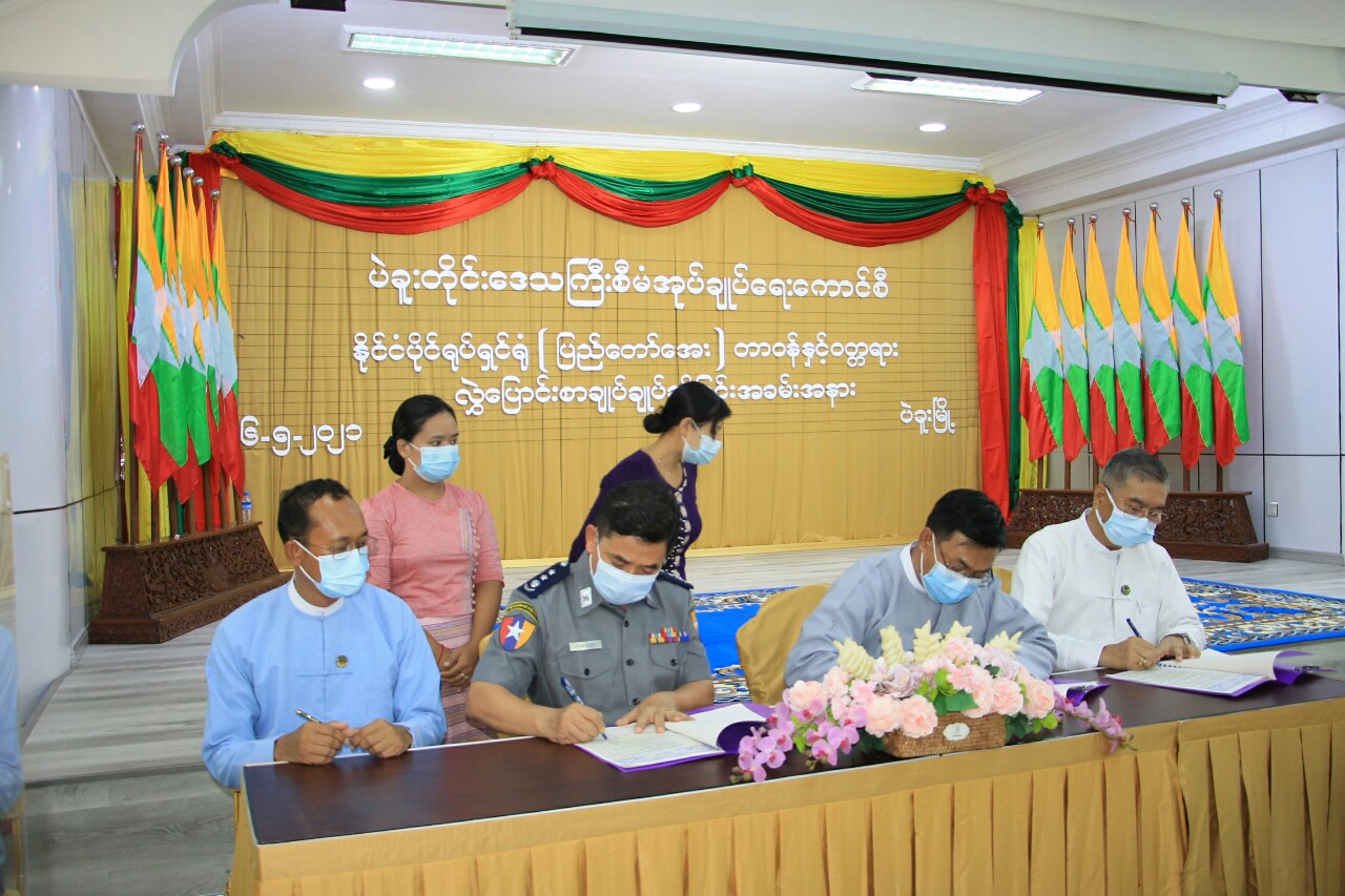 ပဲခူးတိုင်းဒေသကြီးစီမံအုပ်ချုပ်ရေးကောင်စီရုံး၊ တော်ဝင်ဟံသာအစည်းဝေးခန်းမ၌ မေလ (၆)ရက်နေ့၊ နံနက်(၁၀)နာရီအချိန်က ပြည်မြို့ရှိ နိုင်ငံပိုင်ရုပ်ရှင်ရုံ(ပြည်တော်အေး)၏ တာဝန်နှင့် ဝတ္တရား လွှဲပြောင်းခြင်းနှင့် စာချုပ်ချုပ်ဆိုခြင်း အခမ်းအနား ကျင်းပပြုလုပ်သည်။