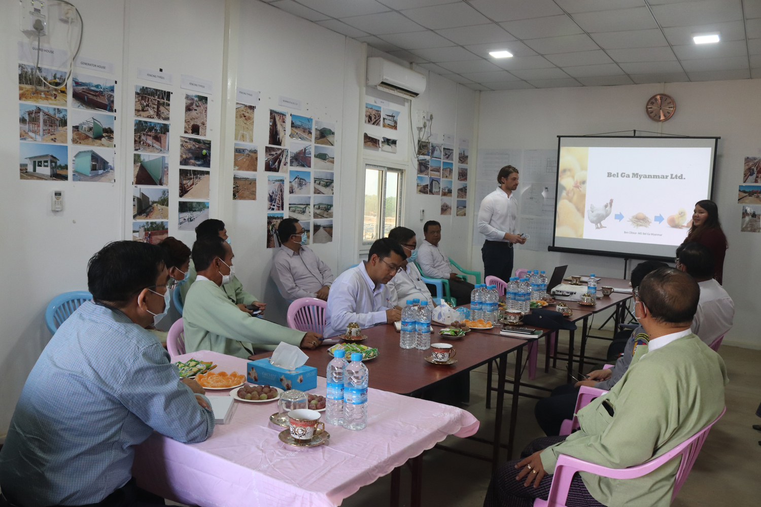 ရှေးဦးစွာ Bel Ga Myanmar Co., Ltd ၏ Farm(2) တည်ဆောက်ရေး ရှင်းလင်းဆောင်၌ မန်နေဂျင်းဒါရိုက်တာ Mr. Ben Cliteur က Farm(1) စက်ရုံလည်ပတ်နေမှုအခြေအနေ၊ Farm(2) စက်ရုံတည်ဆောက်နေမှုအခြေအနေ၊ ရင်းနှီးမြှုပ်နှံမှုအခြေအနေ၊ လျှပ်စစ်မီးရရှိရေးနှင့် ကုန်ထုတ်လမ်း လိုအပ်ချက်များအား Power Point ဖြင့် အသေးစိတ် ရှင်းလင်းတင်ပြခဲ့သည်။