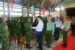ယင်းနောက် နယ်မြေခံသင်တန်းကျောင်းခန်းမ၌ တိုင်းဒေသကြီး ဝန်ကြီးချုပ်နှင့် တိုင်းမှူးတို့က ဂုဏ်ပြုနှုတ်ဆက် စကားပြောကြားခဲ့ပါသည်။ ထို့နောက် သင်တန်းသားများအား ဂုဏ်ပြုချီးမြှင့်ငွေနှင့် စားသောက်ဖွယ်ရာများ ပေးအပ်ခဲ့ပြီး တိုင်းဒေသကြီး ဝန်ကြီးချုပ်၊ တိုင်းမှူး၊ အစိုးရအဖွဲ့ဝင် ဝန်ကြီးများ၊ တပ်မတော်မှအရာရှိကြီးများနှင့် တာဝန်ရှိသူများက သင်တန်းသားများအား ရင်းရင်းနှီးနှီး နှုတ်ဆက်အားပေး စကားပြောကြားခဲ့ကြောင်း သတင်းရရှိသည်။