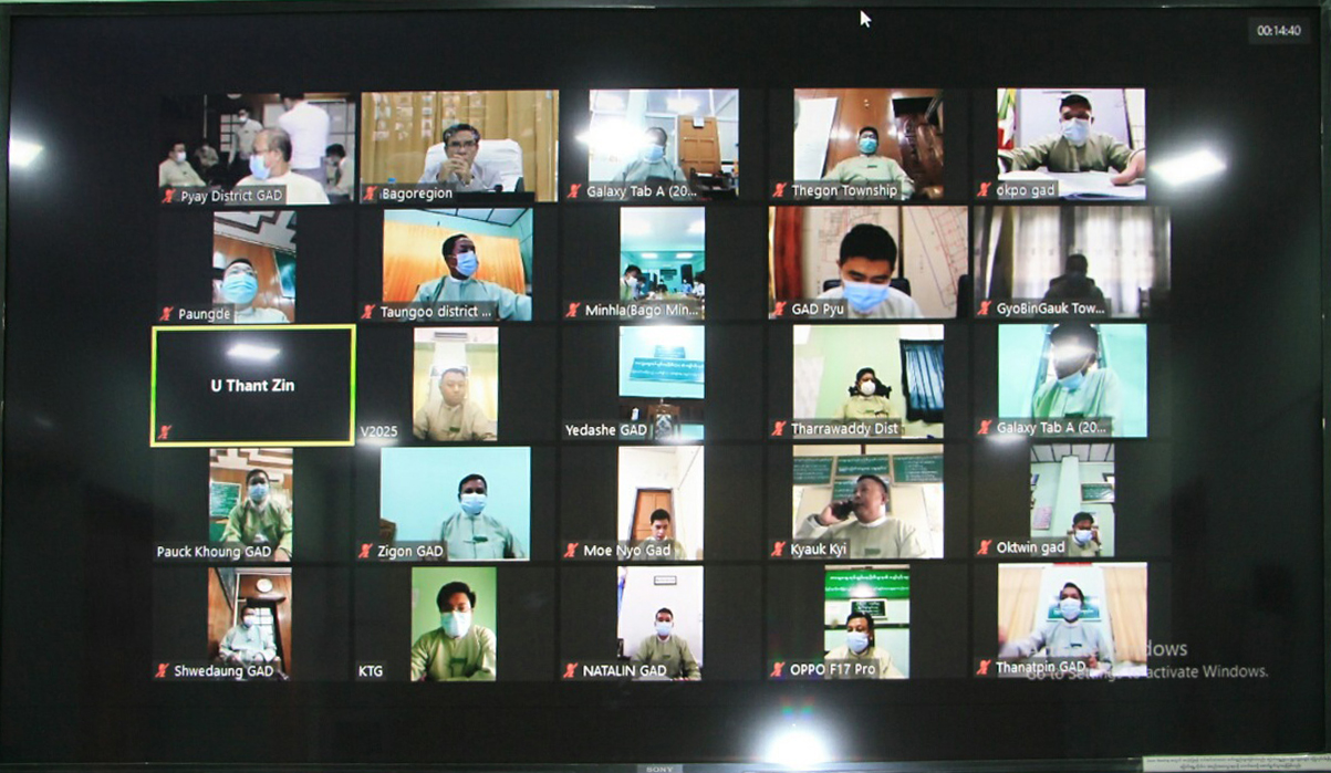 ပဲခူးတိုင်းဒေသကြီးစီမံအုပ်ရေးကောင်စီ ဥက္ကဋ္ဌ ဦးမျိုးဆွေးဝင်းဦးဆောင်၍ ဇွန်လ(၂၅)ရက်နေ့ မွန်းလွဲပိုင်းက တိုင်းဒေသကြီးအစည်းအဝေးခန်းမ၌ ပဲခူးတိုင်းဒေသကြီး COVID-19 ရောဂါ ထိန်းချုပ်ရေးနှင့် အရေးပေါ်တုံ့ပြန်ရေးကော်မတီ လုပ်ငန်းညှိနှိုင်း အစည်းအဝေးအား Online Zoom Meeting System ဖြင့်ကျင်းပပြုလုပ်သည်။