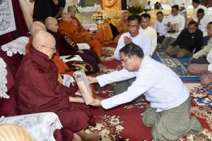ထို့နောက် တိုင်းဒေသကြီး ဝန်ကြီးချုပ် ဦးမျိုးဆွေဝင်းက ပဲခူးမြို့၊ ကြခတ်ဝိုင်းပရိယတ္တိစာသင်တိုက်၏ ဦးစီးပဓာန နာယကဆရာတော်၊ သာသနာ့မဏ္ဍိုင်ပါဠိတက္ကသိုလ်ကျောင်းတိုက် ဦးစီးပဓာနနာယက ဆရာတော် နှင့် ရန်ကုန်မြို့၊ ဗဟန်းမြို့နယ်၊ ပါဠိတက္ကသိုလ်ညောင်တုန်းကျောင်းတိုက် ပဓာနနာယက လှရတနာဆရာတော် တို့ သင်္ကန်းအစရှိသော လှူဖွယ်ဝတ္တုပစ္စည်းများ ဆက်ကပ်လှူဒါန်းခဲ့သည်။ ၎င်းနောက် တိုင်းဒေသကြီးအစိုးရ အဖွဲ့ဝင် ဝန်ကြီးများနှင့် အလှူရှင်များက ကြွရောက်လာသည့် ဆရာတော်/သံဃာတော်များ သင်္ကန်းနှင့် လှူဖွယ်ဝတ္တုပစ္စည်းများ အသီးသီး ဆက်ကပ်လှူဒါန်းခဲ့ကြသည်။