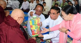 ပြည် ဖေဖော်ဝါရီ ၂ ပဲခူးတိုင်းဒေသကြီးအစိုးရအဖွဲ့က ကြီးမှူးကျင်းပပြုလုပ်သည့် ပဉ္စမအကြိမ်မြောက် ဆေးပဌာန်း ရွတ်ဖတ်ပူဇော်ပွဲ၊ အောင်ပွဲအခမ်းအနားကို ယမန်နေ့၊ နံနက်ပိုင်းက ပြည်မြို့၊ လေးဆူဓါတ်ပျော် ရွှေဆံတော်စေတီတော်။ မြတ်ကြီး ရင်ပြင်တော်ရှိ ပုညကာရဏ လေးထပ် ဓမ္မာရုံကြီး၌ ကျင်းပပြုလုပ်ရာ ပဲခူးတိုင်းဒေသကြီး ဝန်ကြီးချုပ် ဦးမျိုးဆွေဝင်းနှင့် ဇနီးဒေါ်စိုးစိုးသက်တို့ တက်ရောက် ကြည်ညိုခဲ့သည်။ ရှေးဦးစွာ “နမောတဿ” သုံးကြိမ်ရွတ်ဆို ဘုရားကန်တော့၍ အခမ်းအနားကိုဖွင့်လှစ်ပြီး ပြည်မြို့၊ ရွာဘဲတောင်ပေါ်ကျောင်း ဦးစီးပဓာနနာယက နိုင်ငံတော်ဩဝါဒါစရိယ အဘိဓဇအဂ္ဂမဟာသဒ္ဓမ္မဇောတိက ဘဒ္ဒန္တ ကုမာရ ဆရာတော် အရှင်သူမြတ်ထံမှ ပဲခူးတိုင်းဒေသကြီး ဝန်ကြီးချုပ်နှင့်ဇနီး အမှူးပြုသော ဧည့်ပရိတ်သတ်များက ငါးပါးသီလ ခံယူဆောက်တည် ခဲ့ကြသည်။ ထို့နောက် ပဲခူးတိုင်းဒေသကြီးအစိုးရအဖွဲ့ ဝန်ကြီးချုပ် ဦးမျိုးဆွေဝင်းက သာသနာရေးဆိုင်ရာများ လျှောက်ထားပြီး ဩဝါဒစရိယဆရာတော်ကြီးများထံ တိုင်းဒေသကြီးဝန်ကြီးချုပ်နှင့်ဇနီး၊ တာဝန်ရှိသူများက ဆေးပစ္စည်း အလှူတော်များ …