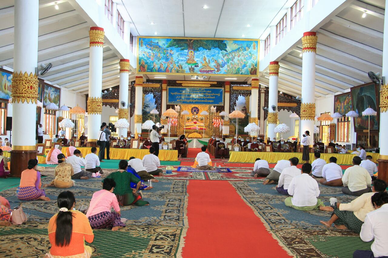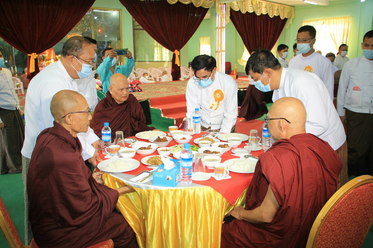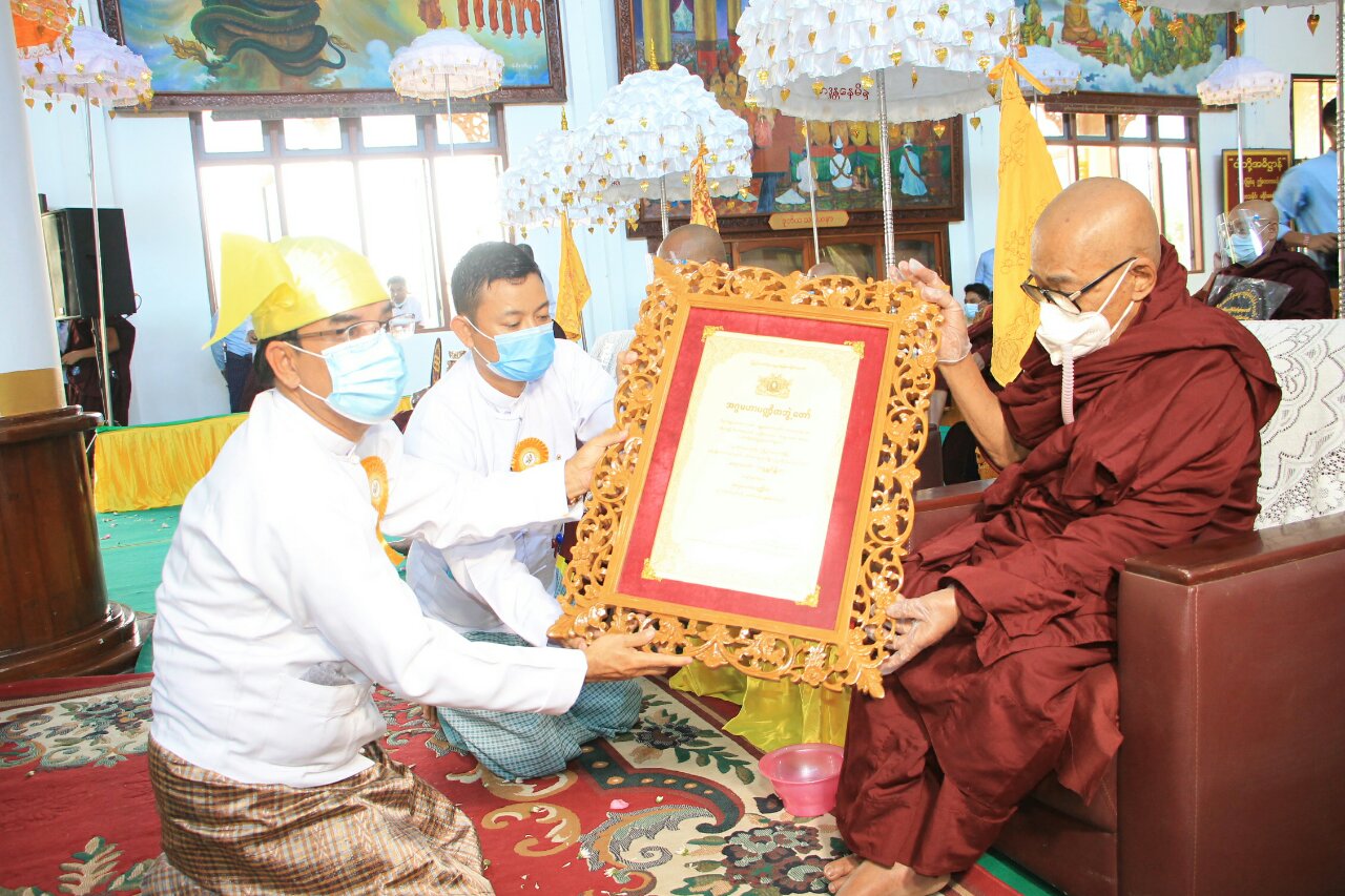ယင်းနောက် ပဲခူးတိုင်းဒေသကြီးစီမံအုပ်ချုပ်ရေးကောင်စီ ဥက္ကဋ္ဌ ဦးမျိုးဆွေဝင်းက သာသနာရေး ဆိုင်ရာများ လျှောက်ထားပြီး သာသနာတော်ဆိုင်ရာ ဘွဲ့တံဆိပ်တော်များရရှိသည့် ဆရာတော်များ နှင့်သီလရှင်များအား ပဲခူးတိုင်းဒေသကြီးစီမံအုပ်ချုပ်ရေးကောင်စီ ဥက္ကဋ္ဌ ဦးမျိုးဆွေဝင်း၊ အမှတ်(၇၇)ခြေမြန်တပ်မဌာနချုပ်၊ ဒုတိယတပ်မမှူး ဗိုလ်မှူးကြီး မိုးမင်းနိုင်၊ ကောင်စီဝင်များ၊ အတွင်းရေးမှူးနှင့် ဌာနဆိုင်ရာအကြီးအကဲများက ဘွဲ့တံဆိပ်တော်များနှင့် လှူဖွယ်ဝတ္ထု ပစ္စည်းများ ဆက်ကပ်လှူဒါန်းပေးအပ်ကာ ပဲခူးတိုင်းဒေသကြီး သံဃနာယကအဖွဲ့ အကျိုးတော်ဆောင် ပဲခူးမြို့ နန်းဦးစာသင်တိုက်ဆရာတော် မဟာဂန္ထဝါစကပဏ္ဍိ ဘဒ္ဒန္တသောဘိတထံမှ အနုမောဒနာတရား နာယူပြီး လှူဒါန်းမှုအစုစုအတွက် ရေစက်သွန်းချ အမျှအတမ်းပေးဝေကာ ဗုဒ္ဓသာသနံစိရံတိဌတု သုံးကြိမ်ရွတ်ဆိုဆုတောင်းပြီး အခမ်းအနားကို ရုတ်သိမ်းခဲ့ကြောင်း သိရသည်။